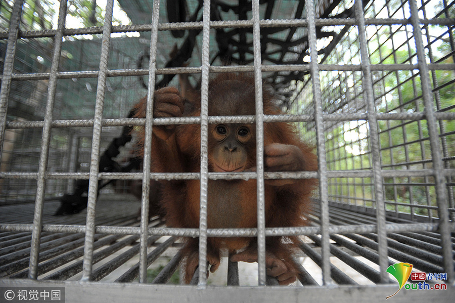 当地时间2018年9月18日,印尼加里曼丹克塔邦,国际动物救援(IAR)猩猩安全与保护中心里,饲养员用独轮车把猩猩宝宝送到森林学校。图片作者:Newscom