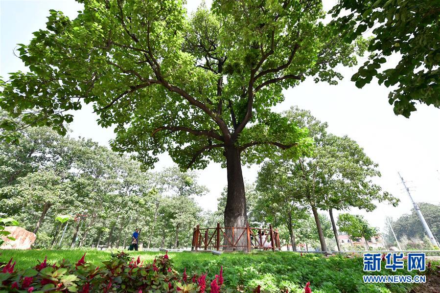 在河南兰考县焦裕禄干部学院门口,游客从“焦桐”下走过(2017年8月9日摄)。新华社记者冯大鹏摄
