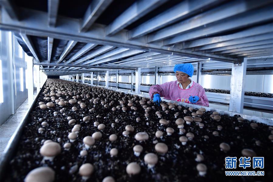 在河南兰考县东坝头乡张庄村,一位村民正在一个食用菌企业的车间内采摘褐蘑菇(6月21日摄)。新华社记者冯大鹏摄