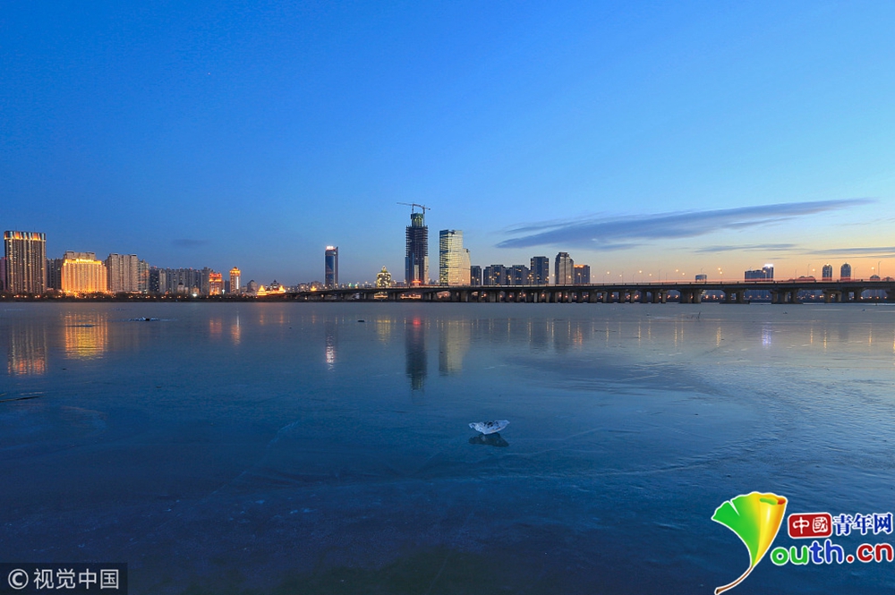 11月23日,黑龙江省哈尔滨市,松花江城区江段今日封江,江面如镜,倒影着冰城靓丽的夜色。