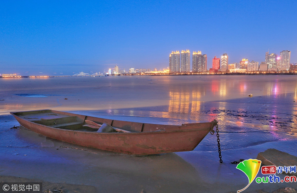 11月23日,黑龙江省哈尔滨市,松花江城区江段今日封江,江面如镜,倒影着冰城靓丽的夜色。