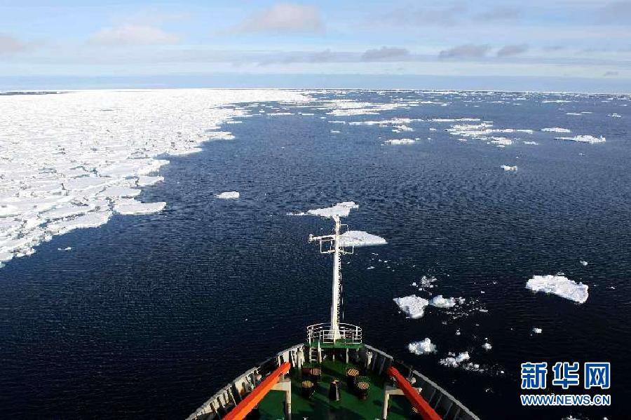 从“雪龙”号驾驶台上放眼望去,浮冰铺满海面,时有冰山立于其间。“雪龙”号沿着浮冰间的空隙行进,碾过浮冰的撞击声不时从船底传来。为减轻船体的震动,航速有所下降,由原来的每小时15节左右降为目前的每小时9节左右(1节约合每小时航行1.852公里)。