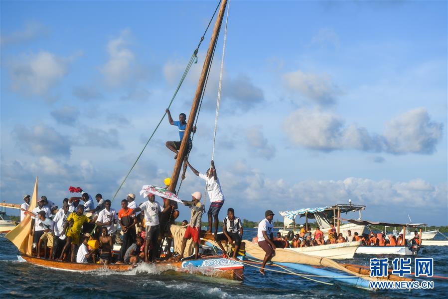 11月24日,在肯尼亚东部印度洋上,赢得独桅三角帆船比赛的拉穆居民庆祝胜利。这种帆船曾是东非海洋贸易的主要交通工具,拉穆本地居民至今还以能驾驭三角帆船为荣。