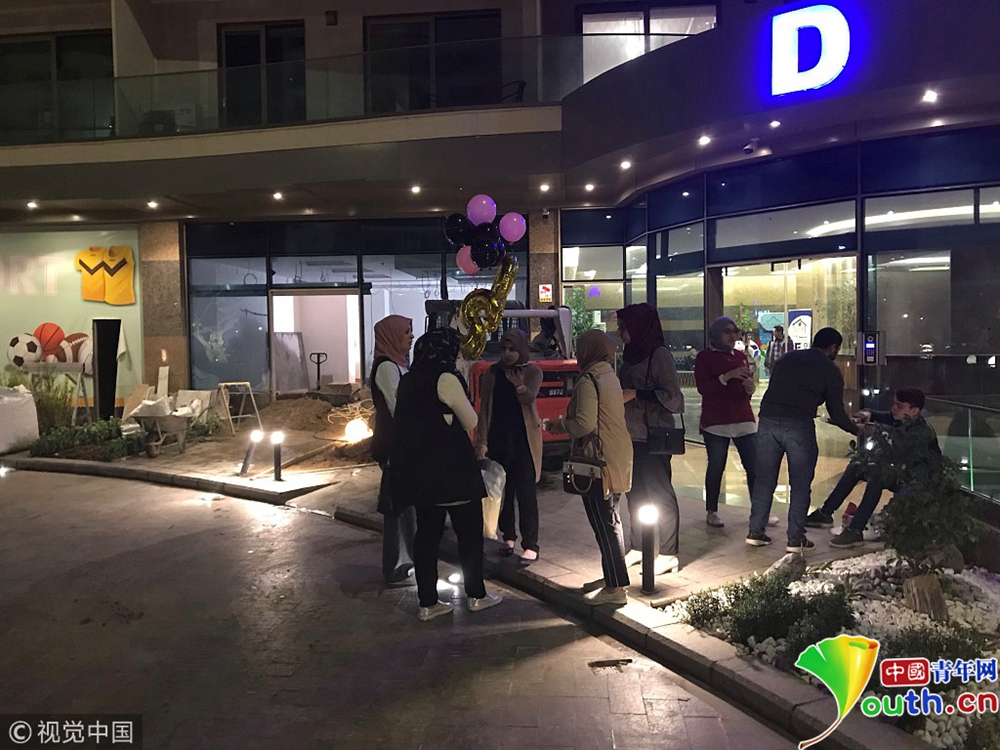 当地时间2018年11月25日,伊拉克埃尔比勒,民众在建筑外避难。伊朗西部克尔曼沙阿省25日发生6.4级地震。目前尚无人员伤亡和财产损失报告。