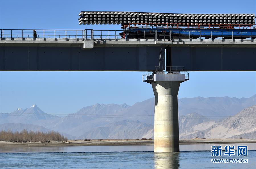 11月26日,施工人员在川藏铁路拉林段贡嘎雅鲁藏布江特大桥上铺轨。