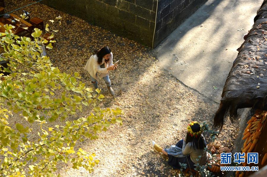 游客在腾冲“银杏村”游玩、拍照(11月20日摄)。新华社记者 林碧锋 摄