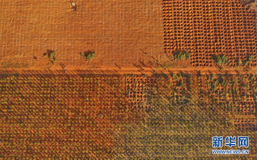 11月25日,迁安市蔡园镇刘庄子村的村民在村北铁矿废料场栽植松树(无人机拍摄)。