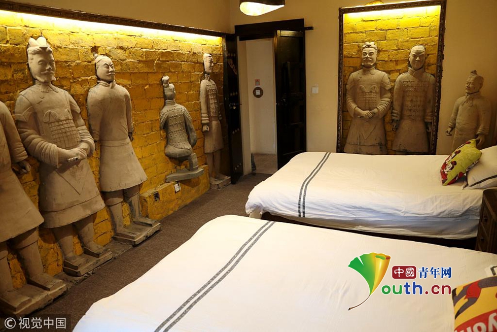 2018年11月27日,西安,民宿卧室内的“兵马俑”装饰。近日,西安一家主打“兵马俑”元素的民宿走红,“兵马俑”元素遍布在房间各个角落,“深情注视”着在此休憩的旅客,加上昏黄的灯光及复古的装饰,让不少旅客感叹如同居住在“秦始皇陵”。 张远(陕西分社)/视觉中国