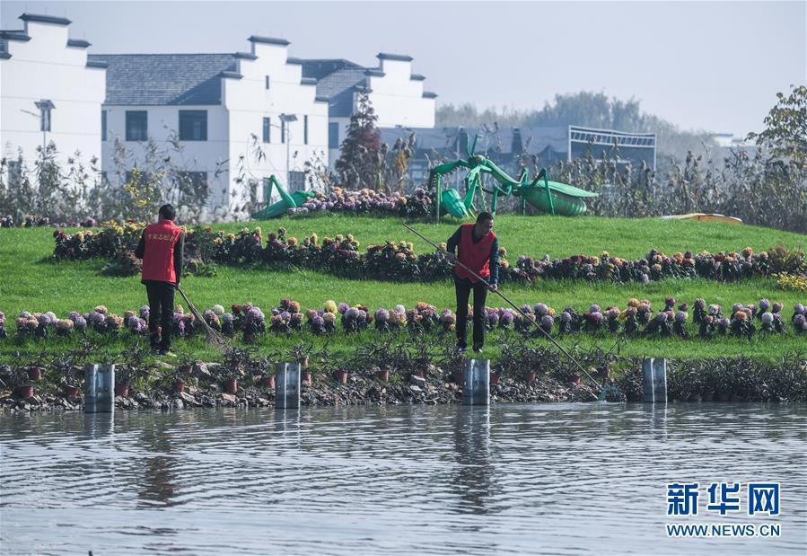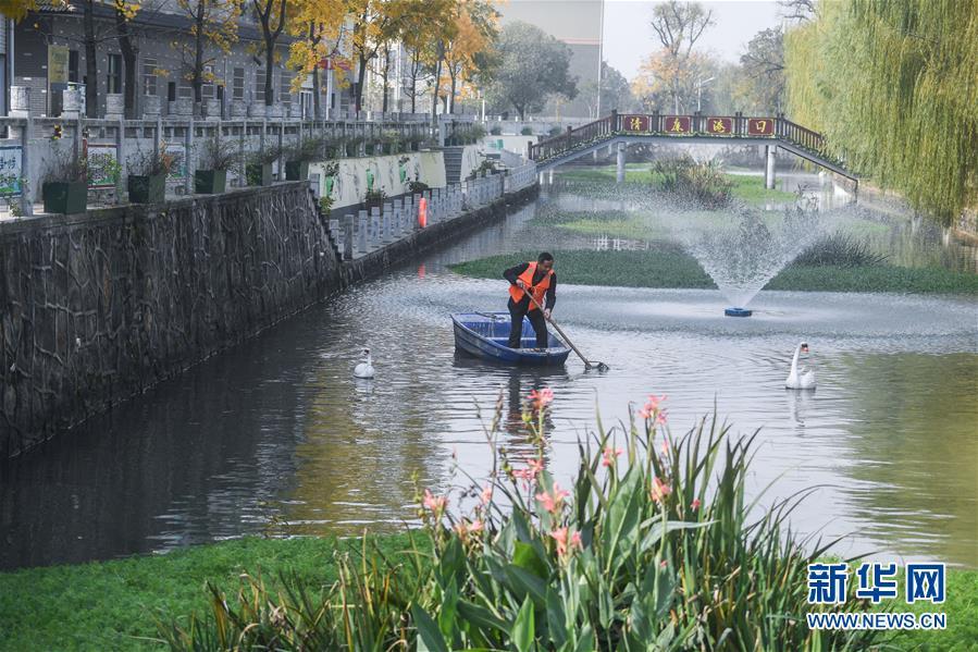 11月28日,林城镇北汤村河长黄双喜(右)在施家边河打捞水面漂浮物。近年来,北汤村全面推进“五水共治”,停止河道内的水产养殖,并进行河道清淤,整治周边环境,另外还结合北汤生态园旅游项目,发展旅游经济,打造水上娱乐设施。现在北汤村施家边河道水质清澈,环境秀美,每年为北汤村吸引游客18万人次。 新华社记者 徐昱 摄