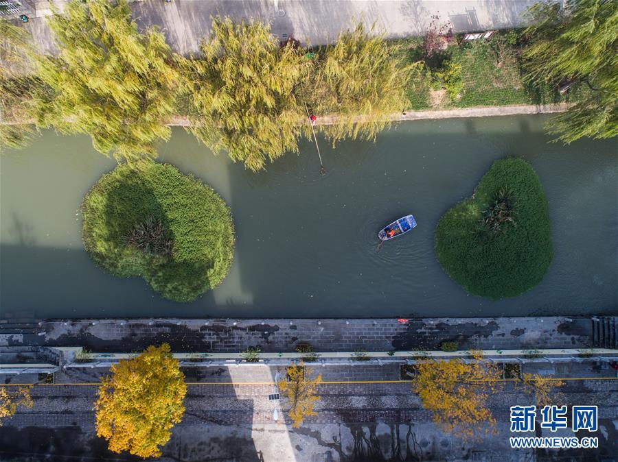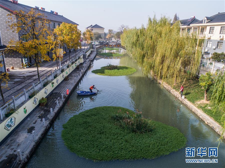 11月28日,长兴县虹星桥镇港口村东港内,工作人员在打捞水面漂浮物(无人机拍摄)。东港全长1500米,环绕港口新村。2012年,新村建成后,港口村通过加固河岸、清理河道、种植浮草等方式对东港进行生态治理,并由该村党总支书记孙根法担任河长,定期开展巡查,引导村民自觉维护河道整洁。 新华社记者 徐昱 摄
