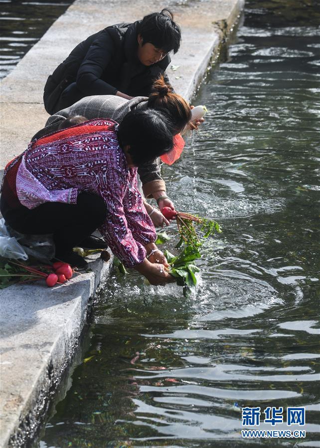 11月28日,月明村的村民在长丰涧溪水边洗菜淘米。近年来通过实施河长制和水环境整治,长兴县夹浦镇月明村对长丰涧进行了清淤,对河两岸绿化进行了补植,修筑堰坝、蓄水引鱼,两岸种植花草,开辟河滩公园,实现了长丰涧景美、岸绿、水清、河畅的目标。 新华社记者 徐昱 摄