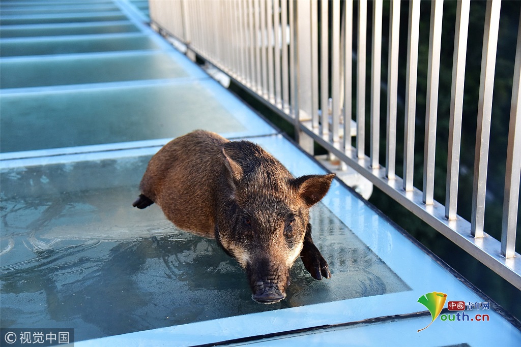 2018年11月29日早上7时多,古龙峡玻璃大峡谷出现了云海奇观,云蒸雾绕,如同仙境。正在玻璃桥上值早班的保安发现,玻璃桥上闯入一只动物,体型还比较大,由于雾气大,不太清楚是什么动物。保安走前一看,竟然发现是1只山猪。