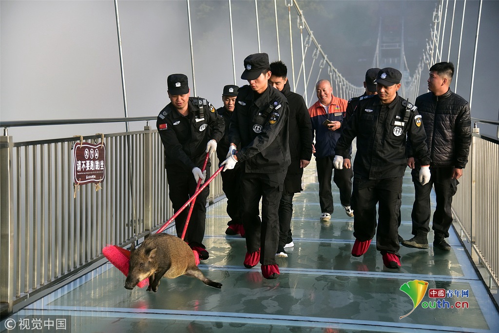 2018年11月29日,一只山猪误入广东清远古龙峡云天玻霸玻璃桥,结果被吓得趴在桥面上发抖,几名值班保安齐心协力将山猪从玻璃桥上解救出来,将其送回森林。