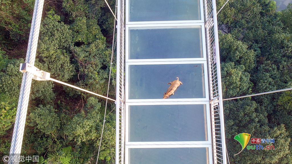 保安估计这只山猪是因为早上雾大误闯入玻璃桥。估计是第一次上玻璃桥,不知道玻璃是何物,加上玻璃下面又是深不见底的大峡谷,山猪非常害怕,浑身发抖,趴在桥上不敢走动。加上玻璃桥上有雾水,山猪后腿不停打滑,更将山猪吓得没了主意。