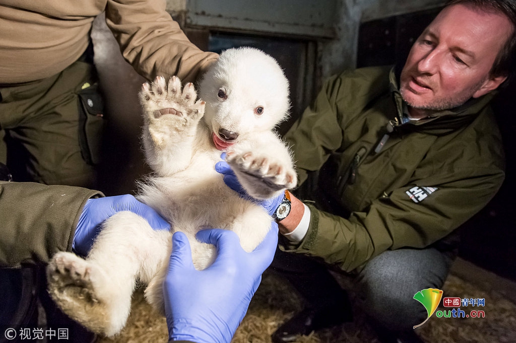 当地时间2017年1月12日,德国柏林,柏林蒂尔加滕动物园为一只雄性北极熊宝宝检查身体。熊宝宝于2016年11月3日出生,身高67厘米,体重4.6千克。