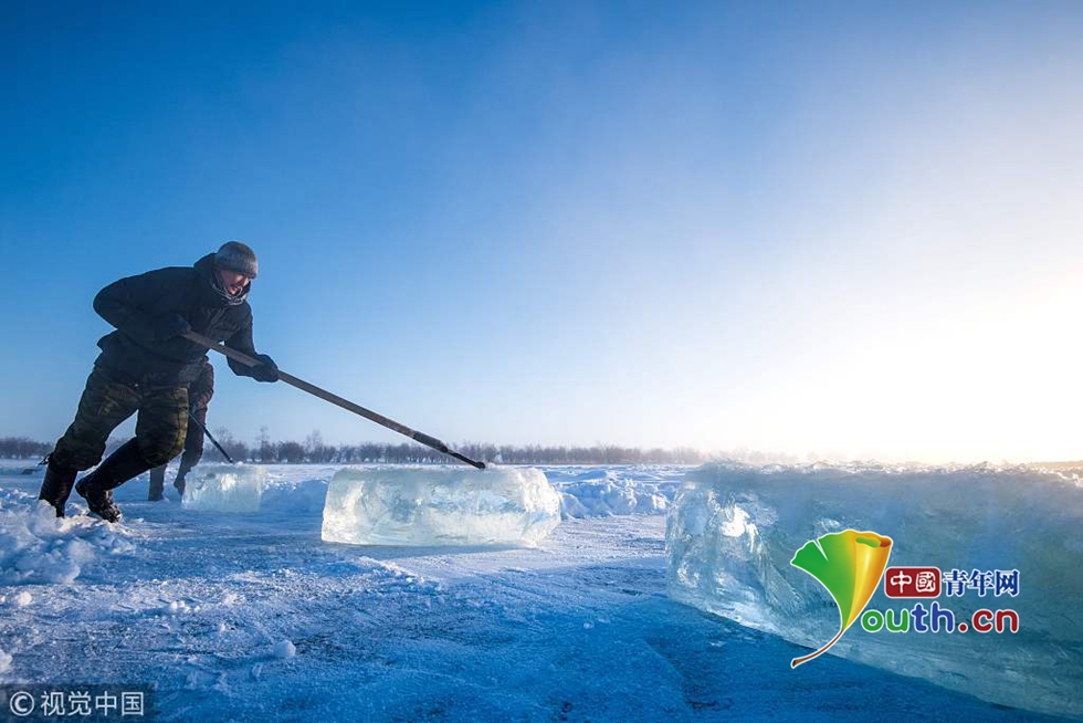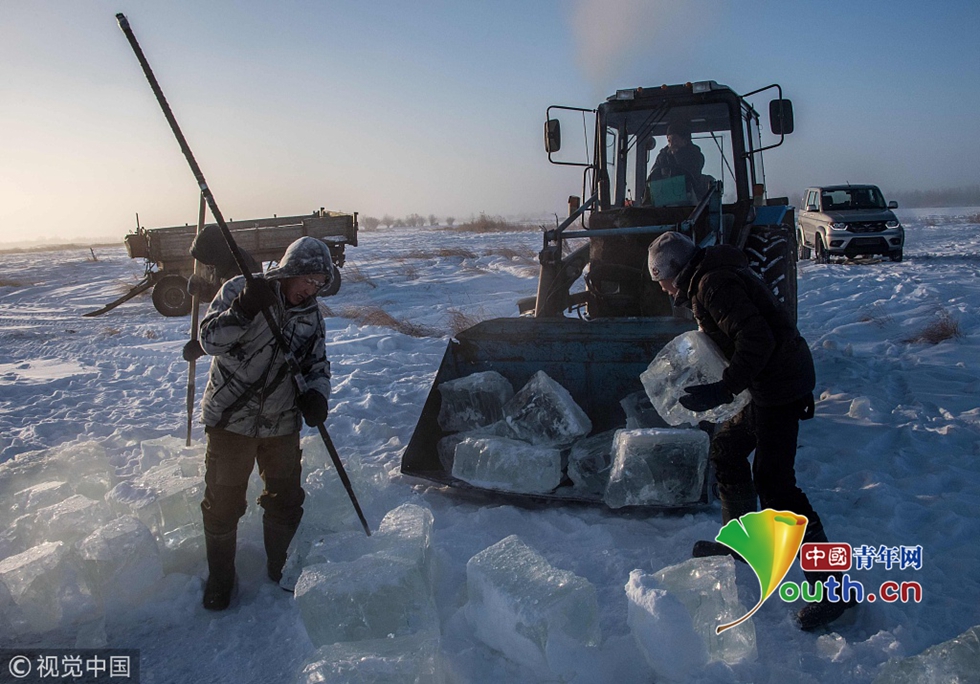 当地时间2018年11月27日,雅库茨克,零下41摄氏度左右的气温下,村民在当地的一个湖中采集冰块。当地很多人依赖于融化冰块解决供水,因为多年冻土覆盖地区冬季气温极低,没有其他的方式供应水。