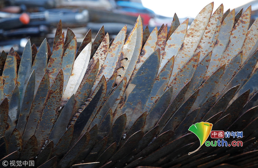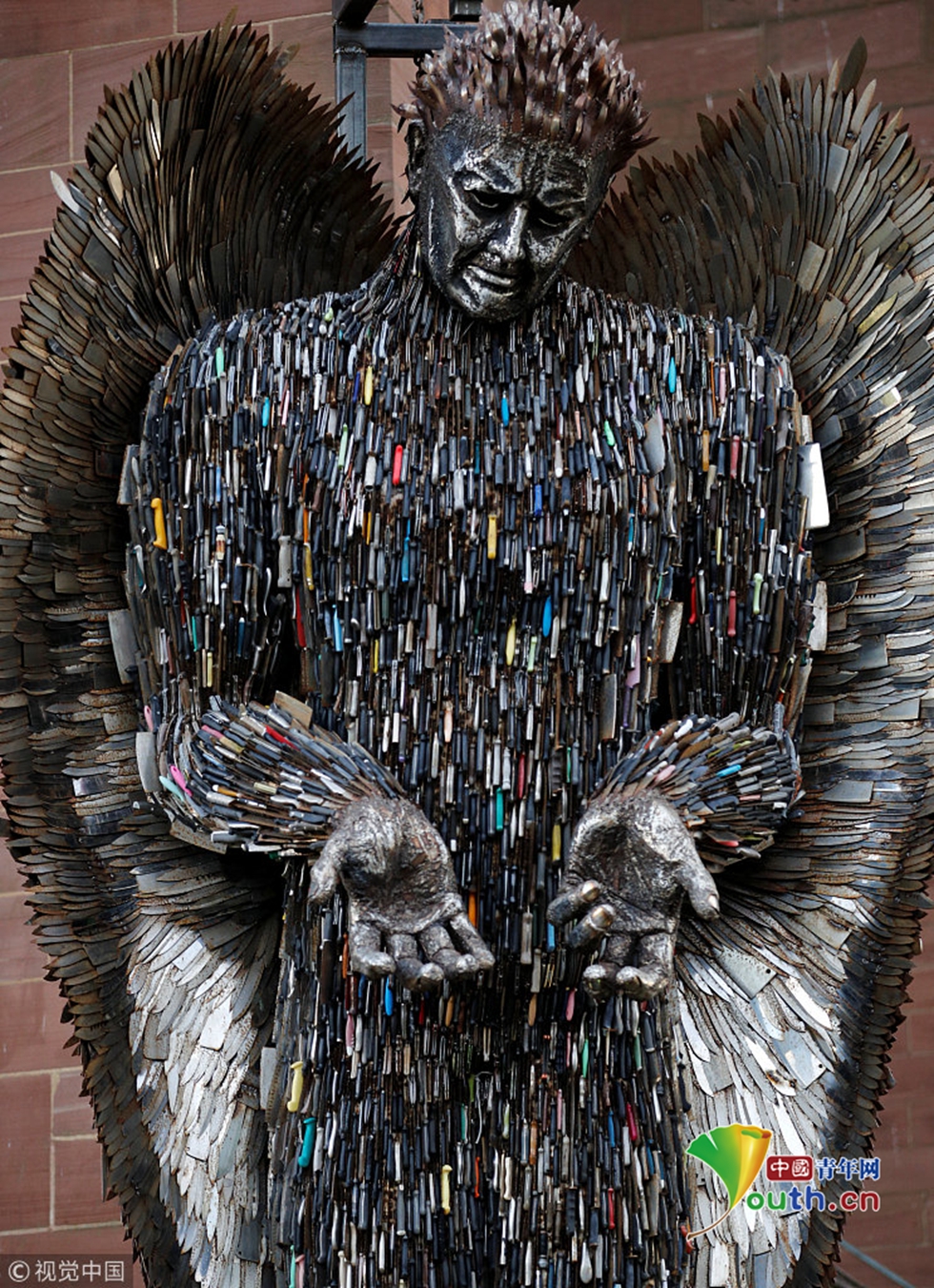 当地时间2018年11月29日,英国利物浦,艺术家阿尔菲·布拉德利在圣公会教堂外用没收的10万多把刀具制作了一尊名为“刀之天使”的塑像。