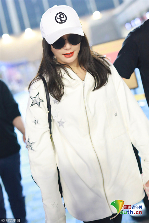 秦岚穿星星外套活力四射 架黑超涂红唇笑靥如花