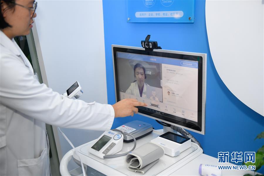 11月6日,乌镇互联网医院的员工在操作“智能医务室”与医生的视频连线功能。据了解,“智能医务室”由智能移动医疗一体机、智能药柜以及一系列检查设备组成,根据健康档案和检查结果,视频连接家庭医生就能解决常见的医疗健康问题。  新华社记者黄宗治摄