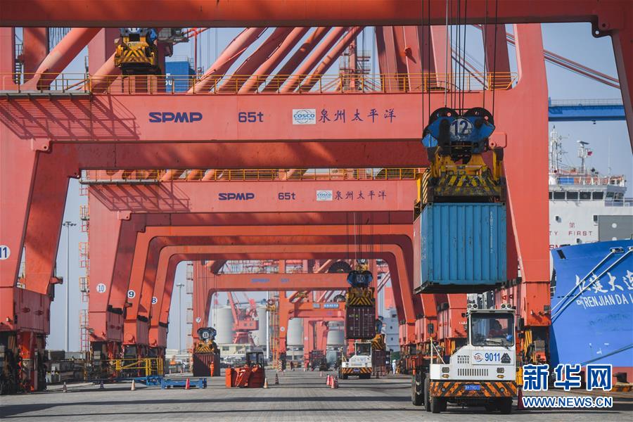 11月29日,在福建省石狮市蚶江镇石湖港区,泉州太平洋码头公司的大型机械在为一艘货轮装货。 新华社记者 宋为伟 摄