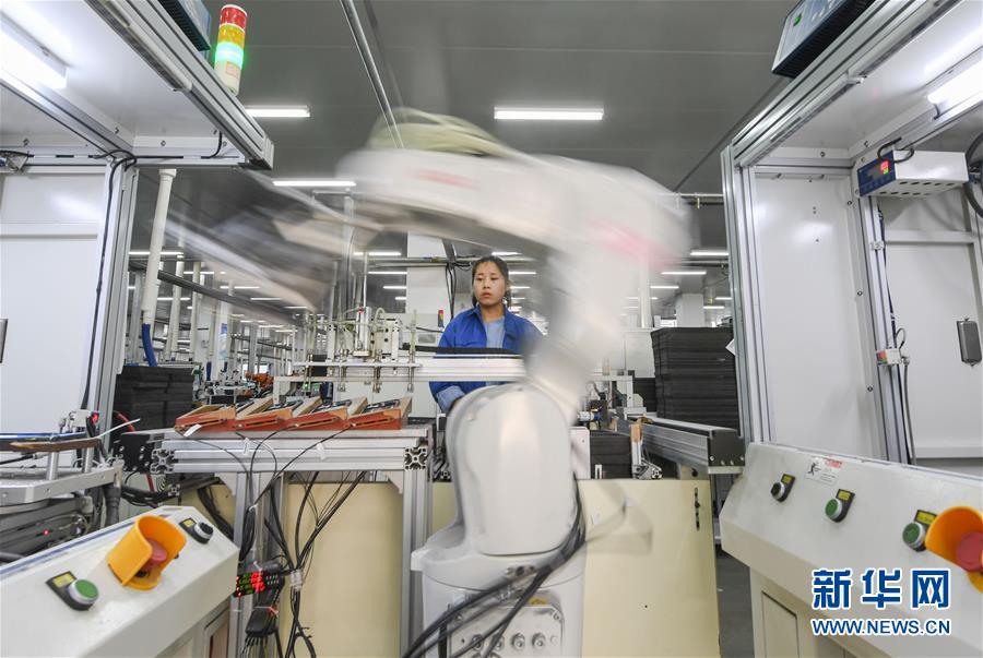11月29日,在位于福建省石狮市蚶江镇的通达集团生产车间,工人在智能机械臂旁实时监控一批小米手机壳的生产情况。 新华社记者 宋为伟 摄