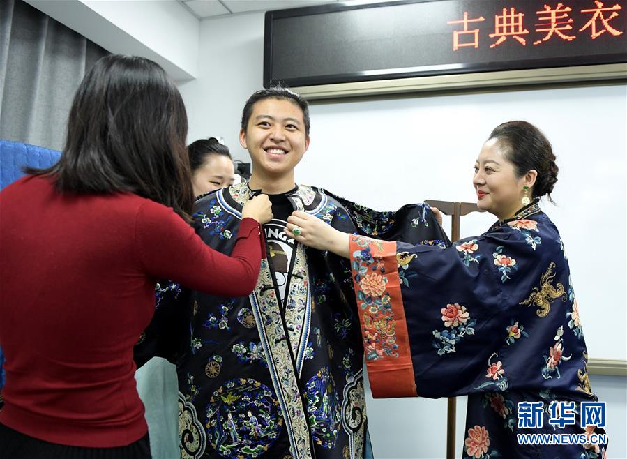 11月30日,在北京服装学院,在毕红(右)的邀请下,一名大学生试穿清代团花刺绣服装。 新华社记者李贺摄