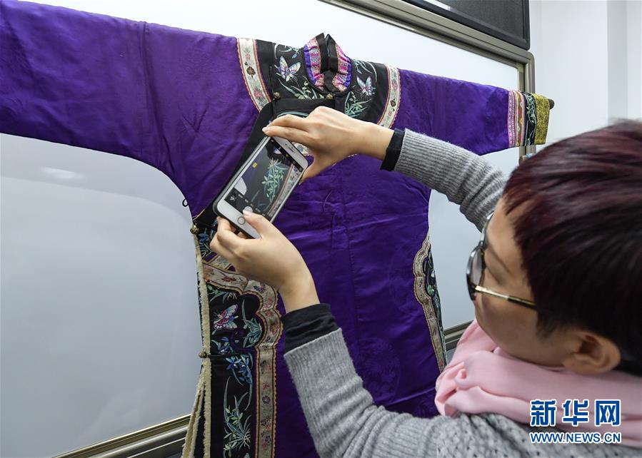11月30日,在北京服装学院,一名学生在拍摄清代女性服装的细节。 新华社记者李贺摄