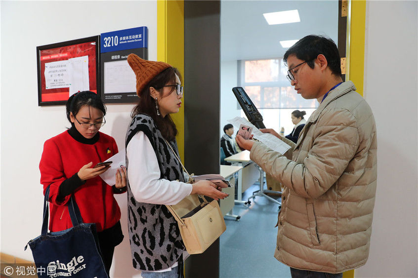 图为2018年12月2日,浙江宁波,浙江万里学院考点,监考老师在核对考生准考证、身份证。张培坚/视觉中国