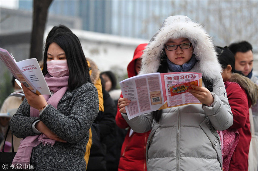 2018年12月2日,北京,在呼家楼中学考场,考生正在抓紧时间进行复习。北京青年报 郝羿/视觉中国