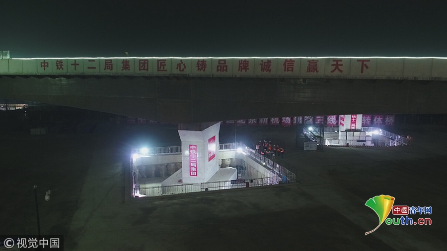 2018年12月1日,北京,大兴国际机场高速公路重要节点工程“三线四桥”同步转体工程顺利完成。机场配套交通“咽喉要道”的打通,标志着大兴国际机场高速公路全线主体基本建成,轨道交通新机场线地上段基本贯通。美立/视觉中国