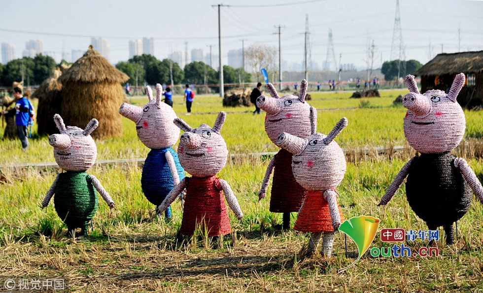 小猪佩奇稻草雕塑成网红 市民游客纷纷来打卡