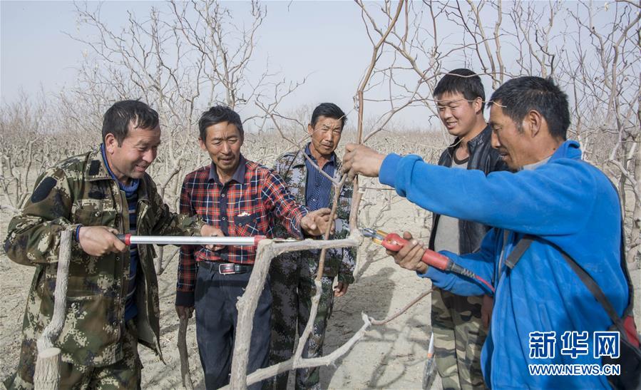 在拜什托格拉克乡依提帕克吾斯唐村的枣地里,当地村民学习修剪枣树枝条(3月19日摄)。 新华社发