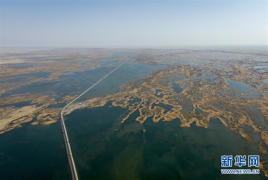 218国道在塔里木河尾闾——台特玛湖中间延伸(2017年10月22日无人机拍摄)。 新华社记者 赵戈 摄