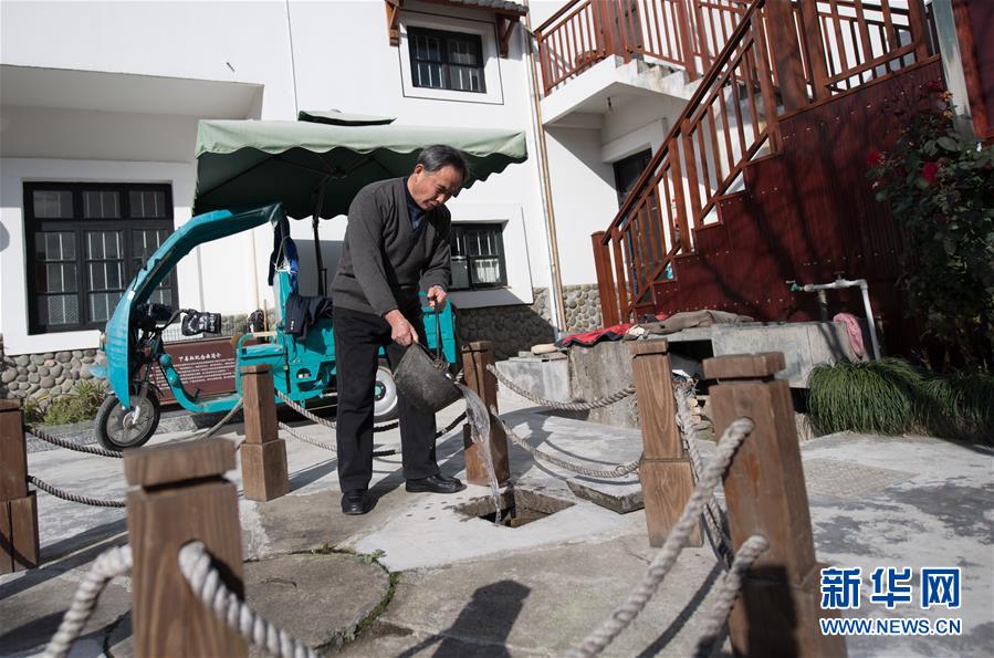 下姜村村民姜祖海给自家沼气池添水(1月10日摄)。