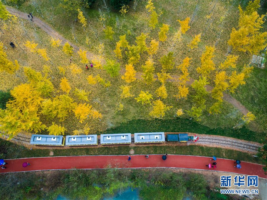 一列观光小火车带着游客穿行在银杏林里(11月16日无人机拍摄)。近日,在浙江省长兴县小浦镇,“十里银杏长廊”和近千亩花海经过近一年的升级改造后,以崭新的面貌与游客见面。花海、观光小火车、古村民宿、银杏长廊等旅游项目全面提升了小浦镇乡村旅游的品质。新华社记者 徐昱 摄