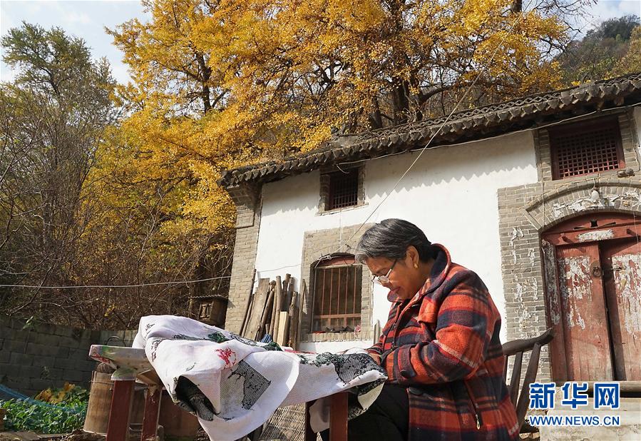 11月1日,河南省嵩县白河乡下寺村的一位村民在自家门前制作刺绣工艺品。 深秋时节,河南省嵩县白河乡下寺村的古银杏林为小山村披上了“金甲”。漫天黄叶,遍地金色,一幢幢民居掩映在色彩斑斓的世界里,美不胜收,吸引了众多游客赏景拍照。 新华社记者 李安 摄