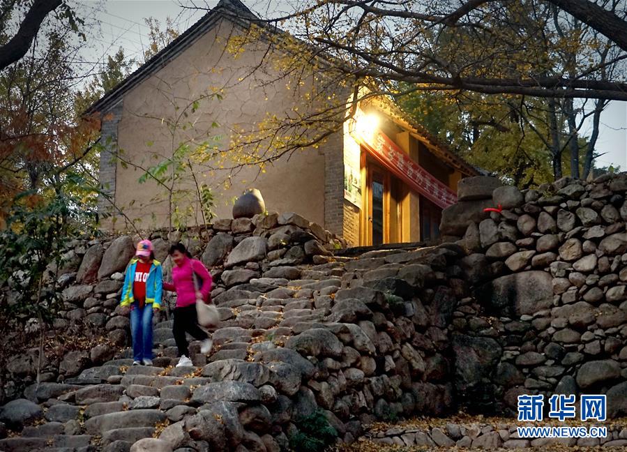 10月31日,在河南省嵩县白河乡下寺村,游客走出一家客栈。 深秋时节,河南省嵩县白河乡下寺村的古银杏林为小山村披上了“金甲”。漫天黄叶,遍地金色,一幢幢民居掩映在色彩斑斓的世界里,美不胜收,吸引了众多游客赏景拍照。 新华社记者 李安 摄