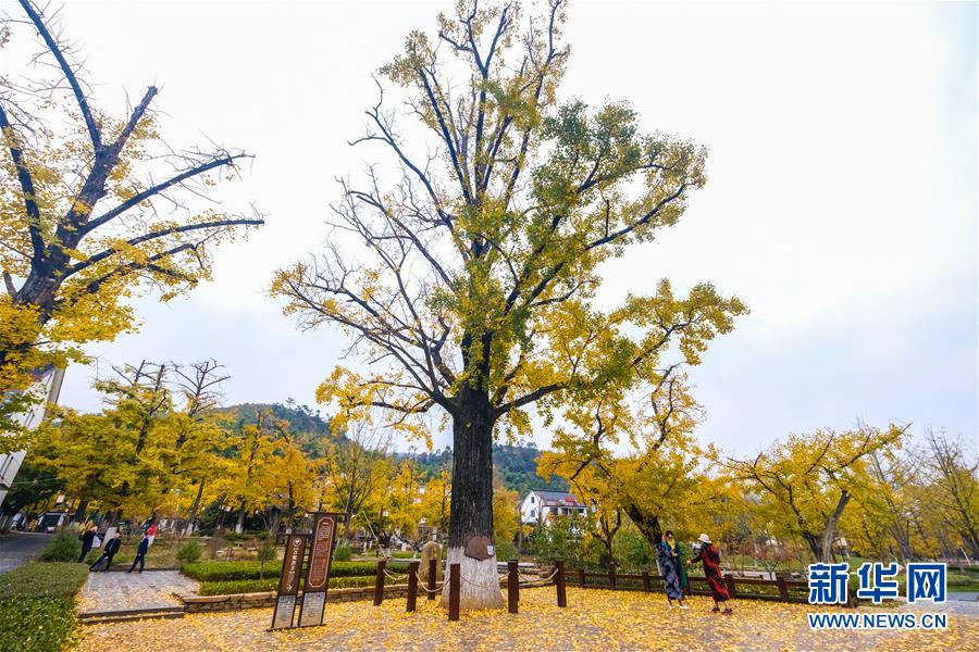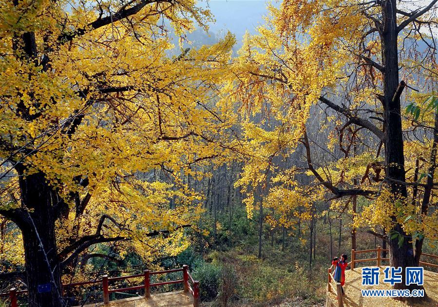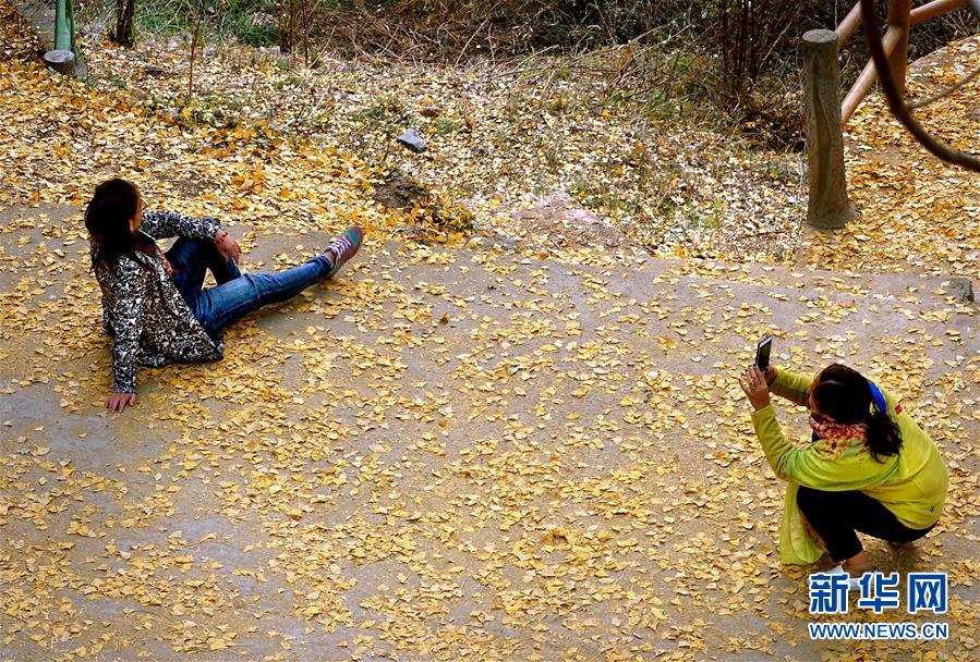 11月1日,游客在河南省嵩县白河乡下寺村古银杏树下拍照赏景。 深秋时节,河南省嵩县白河乡下寺村的古银杏林为小山村披上了“金甲”。漫天黄叶,遍地金色,一幢幢民居掩映在色彩斑斓的世界里,美不胜收,吸引了众多游客赏景拍照。 新华社记者 李安 摄