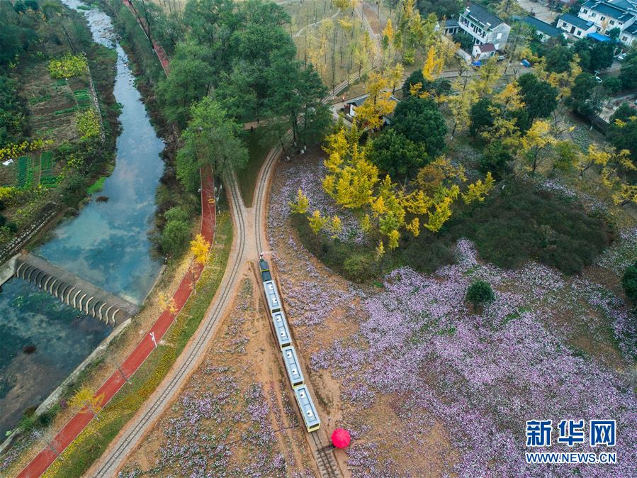 一列观光小火车带着游客穿行在银杏林和花海之间(11月16日无人机拍摄)。近日,在浙江省长兴县小浦镇,“十里银杏长廊”和近千亩花海经过近一年的升级改造后,以崭新的面貌与游客见面。花海、观光小火车、古村民宿、银杏长廊等旅游项目全面提升了小浦镇乡村旅游的品质。新华社记者 徐昱 摄