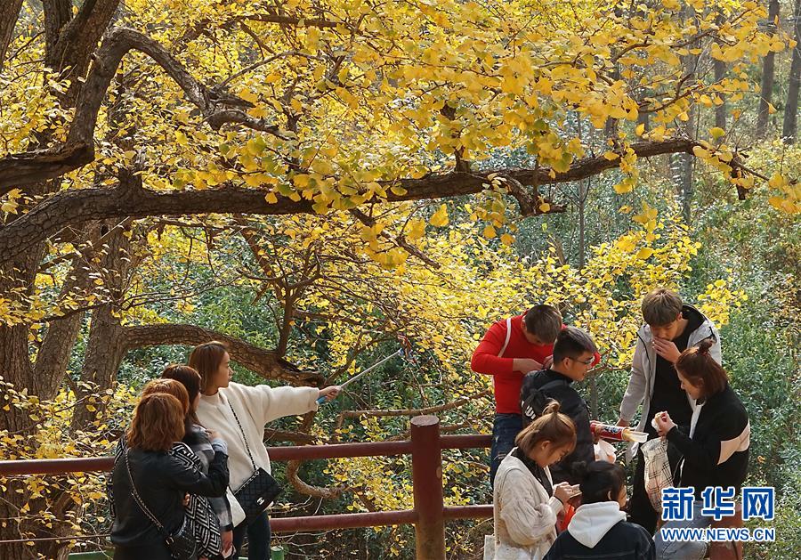 11月1日,游客在河南省嵩县白河乡下寺村古银杏树下拍照赏景。 深秋时节,河南省嵩县白河乡下寺村的古银杏林为小山村披上了“金甲”。漫天黄叶,遍地金色,一幢幢民居掩映在色彩斑斓的世界里,美不胜收,吸引了众多游客赏景拍照。 新华社记者 李安 摄