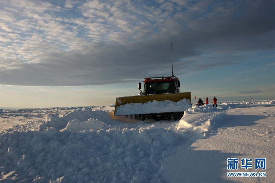 修路小组成员用雪地车装备的铲斗推平积雪(12月1日摄)。 搭载中国第35次南极科考队的“雪龙”号极地考察船日前到达距离中山站44公里处的陆缘冰区,准备迎来本次南极科考首场攻坚战——物资卸运。一支探冰小组随即展开海冰探路,以期尽快打通从“雪龙”号到中山站的冰上运输线,尽早启动冰上运货。 新华社记者 刘诗平 摄