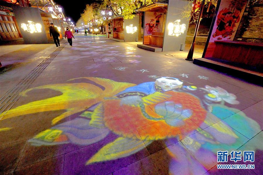 12月4日,杨柳青年画主题灯光布满古镇步行街。 近日,天津市西青区杨柳青古镇在步行街新增9组以杨柳青年画代表作为主题的动态夜景灯光,讲述古镇与年画的历史。 新华社记者 岳月伟 摄