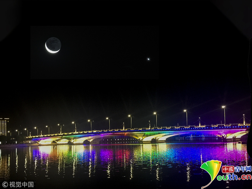 北京市通州区,早上东南方天际上演“金星合月” 美丽景象。