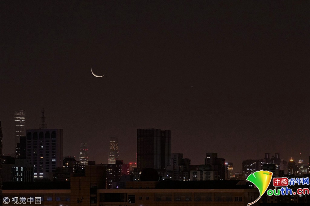 北京,天宇上演“金星合月”,清晨5点时,东南方低空出现一颗明亮的金星和一弯窄月近距离相依相伴的美丽画面。