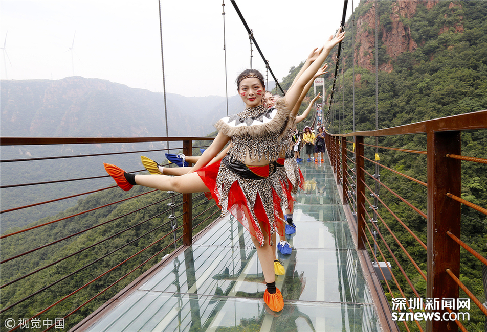 2018年6月30日,郑州新密一景区的玻璃吊桥上,几名美女大学生身穿“野人”服装练习瑜伽,吸引了众多游客的围观。据了解,这些大学生来自郑州。