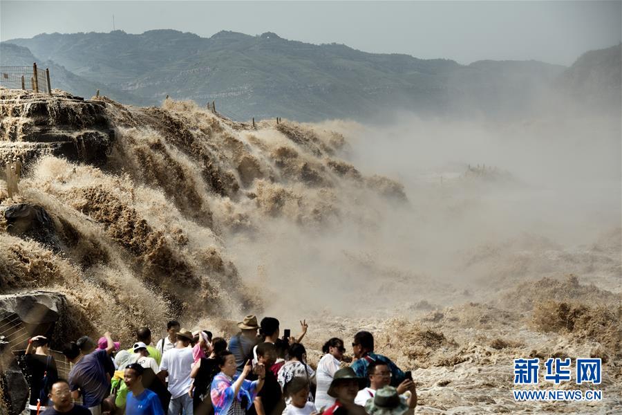 7月19日,游客在陕西境内的壶口瀑布群前留影。 新华社记者陶明 摄
