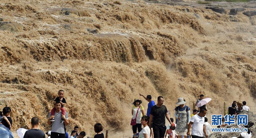7月19日,游客在山西境内的壶口瀑布群前留影。 新华社记者陶明 摄