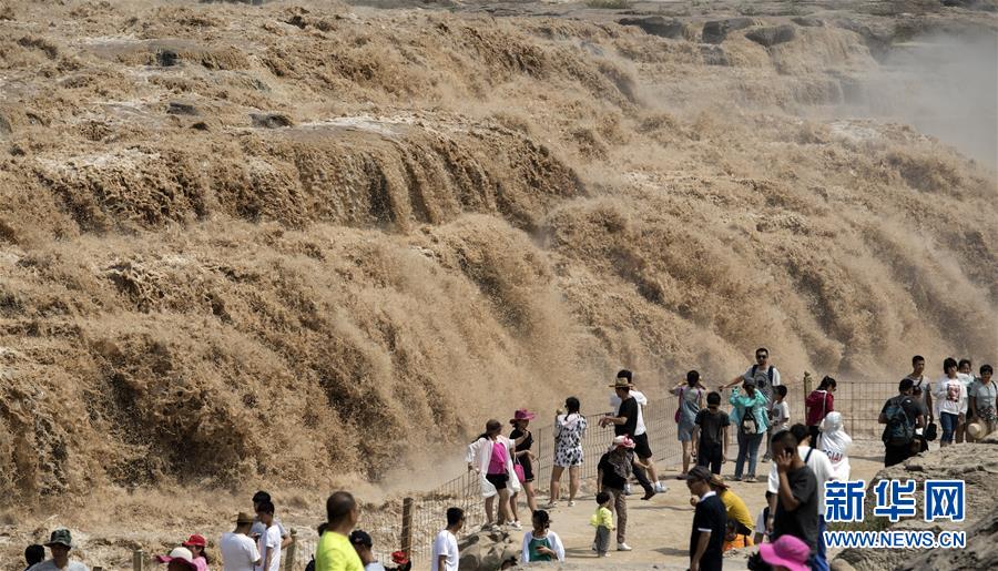 7月19日,游客在山西境内的壶口瀑布群前留影。 新华社记者刘莲芬 摄