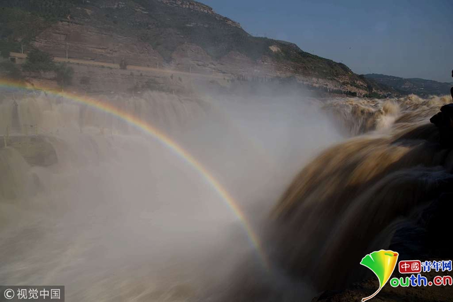 5月31日,山西临汾奔腾咆哮的黄河壶口瀑布吸引游客。近日,受上游地区降雨量增多影响,黄河干流晋陕峡谷水量大增,每秒流量达到1100立方,是常年同期的三倍,壶口瀑布出现五月份罕见的瀑布群景观,吸引了众多游客。