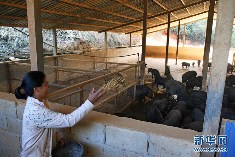 12月3日,在云南省澜沧拉祜族自治县南岭乡黄回村,查山种养农民专业合作社村民在投喂猪饲料。 新华社记者杜涓涓摄